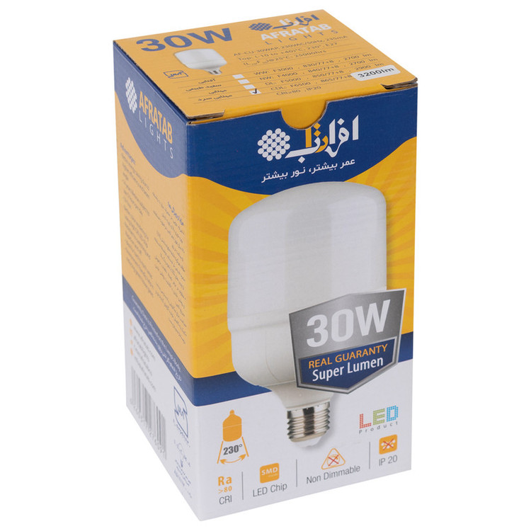 لامپ ال ای دی 30 وات افراتاب در رنگهای آفتابی ، مهتابی موجود است؛ این لامپها تولید نور بیشتری در برابر لامپهای قدیمی دارند و از عمر بیشتری برخوردار هستند. لامپ ال ای دی 30 وات مدل AF-CU-30WAP دارای پخش نور یکنواخت است و شعاع خوبی را با نور مناسب پوشش میدهد. این لامپها دارای استاندارد IP20 است. میزان روشنایی این لامپ 2900 لومن است و قدرت روشنایی خوبی دارد.