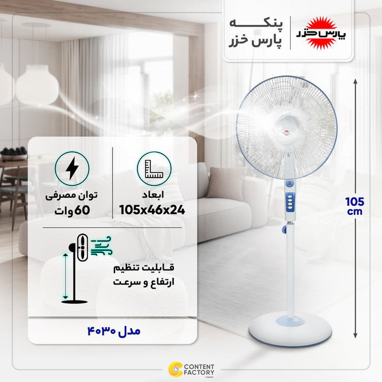 پنکه پارس خزر مدل 4030 از دستگاههای محبوب عرضهشده در بازار است. این مدل جزو بلندترین پنکههای موجود در بازار دستهبندی میشود و با استفاده از لوله استیل تعبیه شده در آن میتوان ارتفاع آن را به 145 سانتیمتر رساند. این مدل هم از پایه فلزی مستحکم با پوشش رنگ اپوکسی استفاده میکند و روی آن کلیدهای تنظیم سرعت در سه حالت کند، متوسط و تند تعبیهشدهاند. بر روی بدنه 4 دکمه قرارگرفته که میتواند دستگاه را در سه سرعت روشن نماید و با دکمه خاموش از کار بیندازد. پایه پنکه طوری طراحیشده است تا در حداکثر ارتفاع پنکه نیز مانع از واژگونی آن شود. ترکیب رنگهای سفید و آبی در بدنه پنکه القا کننده خنکی است. گارد محافظ این پنکه طراحی خوبی دارد و مانع از بروز خطر برای کودکان کنجکاو یا نزدیک شدن سهوی به پرهها توسط افراد میشود. این مدل دارای فیوز حرارتی نیز است که مانع از داغ شدن دستگاه و سوختن موتور میشود. تنظیم زاویه پنکه بهصورت جغجغهای انجام میشود. سیم بلند دستگاه هم باعث میشود تا نیاز به سیمهای رابط نباشد و فاصله زیادی را پوشش میدهد. پارس خزر از قدیمیترین تولیدکنندگان و عرضهکنندگان لوازمخانگی برقی در بازار ایران است که مشتریان زیادی را به محصولات خود پایبند کرده است.
