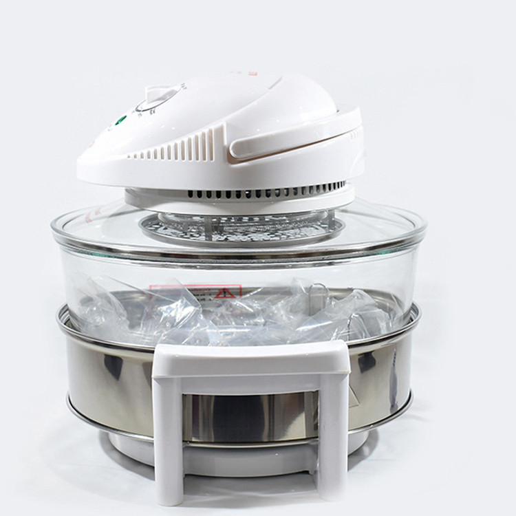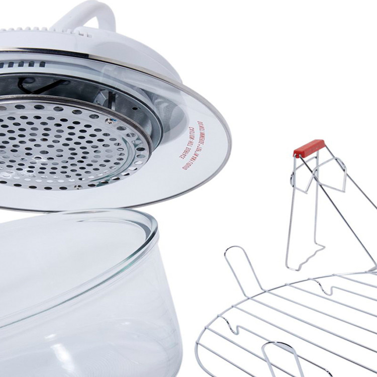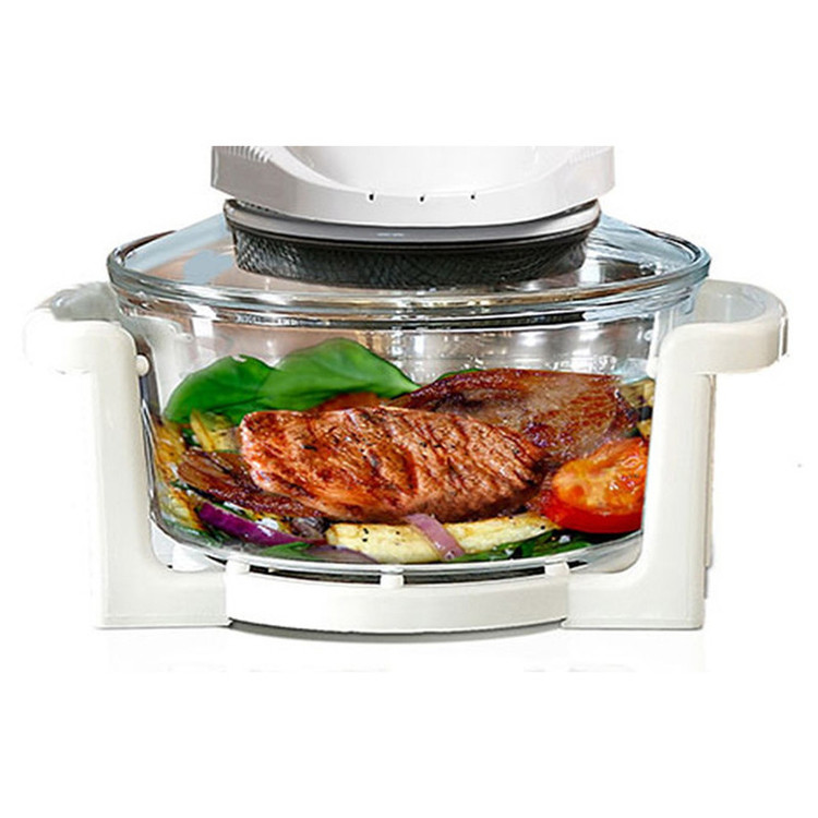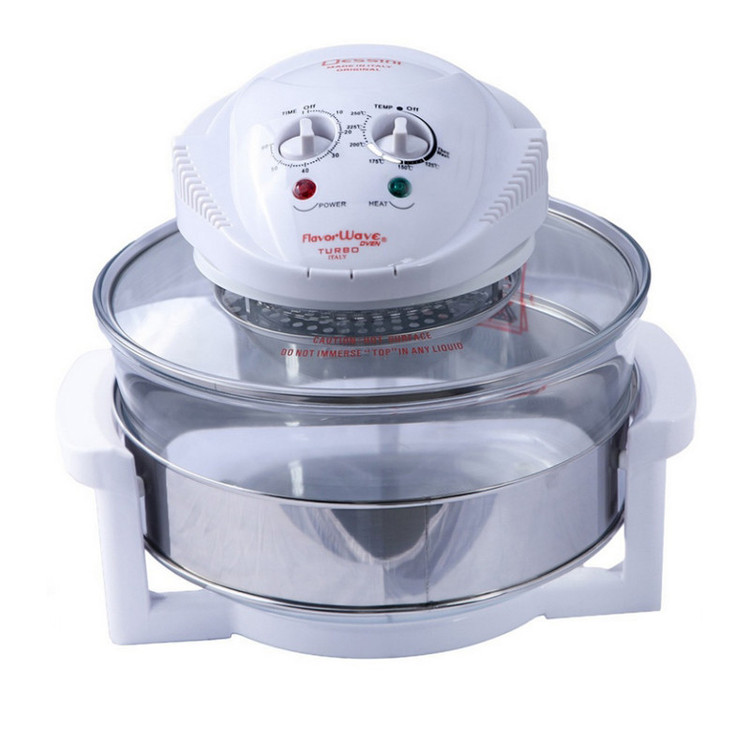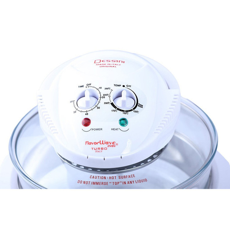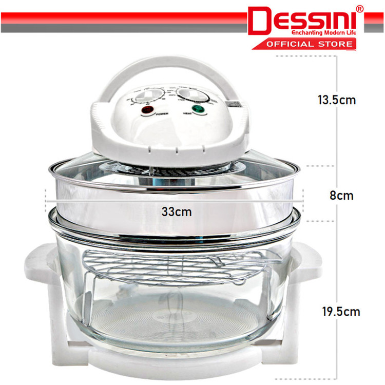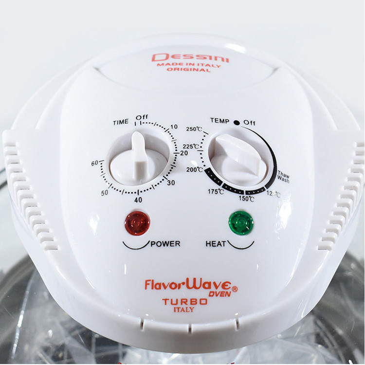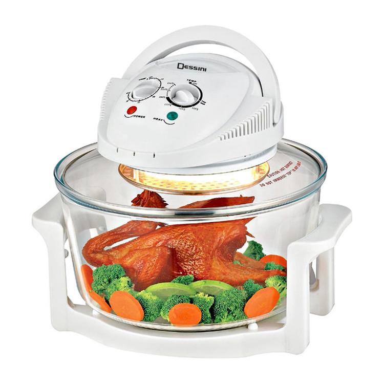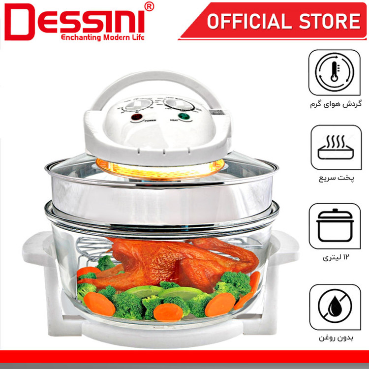 هواپز و فر نوری توربو دسینی، دستگاهی سالم همراه با قیمت مقرون به صرفه است که به لامپ هالوژنی مجهز شده و با تولید امواج نوری و گردش هوای گرم، پخت یکنواخت قسمت های مختلف غذا را در کمترین زمان ممکن به ارمغان می آورد و به جرات می توان گفت، بهترین و سالم ترین دستگاه، جهت طبخ غذا بدون آب و یا روغن محسوب می شود که توانسته طرفداران بسیاری را به سوی خود جذب نماید. عدم نیاز به روغن و یا آب، از ویژگی های برجسته این محصول به شمار می آید و برای افرادی که به دنبال رژیم های کم کالری و یا گیاه خواری هستند، بسیار کاربردی می باشد. گفتنی است، این دستگاه علاوه بر طبخ غذای رژیمی، از سرعت پخت بیشتری نسبت به دیگر دستگاه های مشابه موجود در بازار برخوردار است . بوسیله این فرنوری توربو دسینی می توان بدون هیچ محدودیتی انواع خوراکی ها را با تنظیم زمان، براساس نوع مواد غذایی طبخ نمود. این دستگاه با بهره گیری از موتوری با توان 1200 وات، برای مصارف خانگی بسیار ایده آل می باشد. فر هالوژنی Dessini Turbo دارای ظرف شیشه ای شفاف با ظرفیت 12 لیتر است و برای پخت کیک، بخارپز کردن، برشته و بریانی کردن، سرخ کردن بدون روغن، پخت پیتزا، تست نان، خشک کردن میوه، پخت کیک، یخ زدایی مواد منجمد و ... بسیار کاربردی خواهد بود. این هواپز دسینی مدل توربو به گونه ای است که می توان به صورت همزمان از دو طبقه برای طبخ غذاهای متفاوت استفاده کرد. این محصول به صورتی طراحی شده تا روغن و چربی موجود در مواد غذایی به ته ظرف ریخته شود و در نتیجه، با عدم جذب روغن به مواد در حال پخت، بتوان غذای سالم تری را تهیه نمود. همچنین این مدل به تایمر قابل تنظیم 60 دقیقه ای نیز مجهز شده و با امکان تنظیم درجه حرارت متناسب با نوع مواد غذایی، آشپزی را آسان تر کرده است.