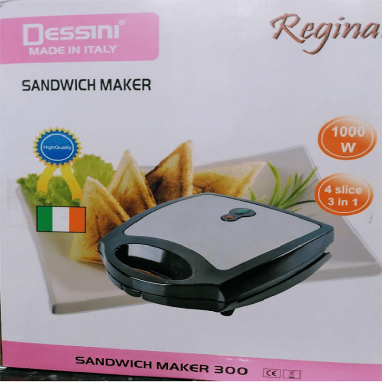 شرکت ایتالیایی دسینی (Dessini) یکی از تولید کنندگان بنام ومشهور ایتالیایی است. این شرکت در تولید انوع لوازم خانگی سابقه درخشانی دارد وبه دلیل کیفیت بسیار بالا ، طراحی های متنوع ،نوآوری ،استفاده از مواد با کیفیت، قیمت مناسب و خدمات پس از فروش این شرکت از استقبال زیادی بین مردم برخوردار است.ساندویچ ساز 4 خانه ی سه کاره مدل 300 با داشتن چهار خانه می تواند چهار نان تست را در خود جای دهد و 8 تکه ساندویچ مثلث تهیه کنید.صفحات حرارتی روکش نچسب دارد و در صورتی که ماده ای خوراکی مانند پنیر در اثر حرارت آب شود و روی آن بریزد، به راحتی تمیز می شود و آسیبی به دستگاه نمی رسد.دارای سه صفحه با سه کاربرد مختلف است :- سینی 4 خانه برای تهیه ی 8 تکه ساندویچ- یک سینی نچسب بزرگ که می توان غذاهایی مانند فیله مرغ،استیک و گریل انواع گوشت را تهیه کرد.- وافل سازدستگیره و بدنه ی این دستگاه عایق حرارتی بوده و هنگام فعالیت خنک می ماند.بر روی آن دو چراغ مربوط به ترموستات دستگاه تعبیه شده است تا وضعیت عملکرد دستگاه را نشان دهد.طراحی ساندویچ ساز طوری است که برای اشغال کمتر فضا به صورت عمودی نیز می ایستد.توان مصرفی آن 1000 وات است که با توجه به توان بالای دستگاه تهیه ساندویچ را سریع و با کیفیت انجام می دهد.از نقاط قوت این دستگاه دکمه ارتجاعی برای تعویض صفحات و قابلیت جدا شدن سینی هاست که به راحتی تمیزو شسته می شود.