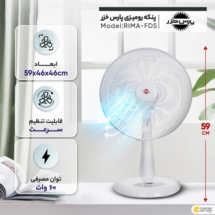 پنکه «پارسخزر» مدل «RIMA-FDS» از پنکههای طرح رومیزی است که توسط اینشرکت تولید و بهبازار عرضه شده است. پنکهها همچنان از دستگاههای سرمایشی محبوب هستند که در خانه و ادارات کاربرد فراوانی دارند. از مزایای پنکهها نسبتبه دیگر دستگاههای سرمایشی میتوان به امکان جابجایی آسان، قابلیت تنظیم زاویه وزش باد، و همچنین وزش باد با گردش افقی اشاره کرد. این مدل دارای چهار پره است که بین دو صفحه محافظ مشبک قرار گرفته است. کاربر ازطریق کلیدهای تعبیهشده روی پایه، قادر به خاموش و روشن کردن و تغییر تنظیمات دستگاه است. کلیدهای تنظیم سرعت در سه حالت بوده و بهصورت لمسی است و نشانگر LED نیز دارد. قابلیت تنظیم گردش افقی نیز از دیگر مشخصاتی است که میتواند به کارایی این دستگاه برای خنککردن محیط موردنظر اضافه کند. این دستگاه بهراحتی بهمحل موردنظر جابهجا میشود. طراحی کلاسیک پنکه رومیزی پارسخزر RIMA-FDS به رنگ سفید، و پایه زیبای این مدل آنرا به انتخابی قابلتأمل برای مصرفکنندگان مختلف تبدیل میسازد. از دیگر قابلیتهای این دستگاه میتوان به موتور مجهز به فیوز حرارتی آن اشاره کرد که نگرانیهای حاصلاز فعالیت طولانیمدت این دستگاه را مرتفع میسازد. لازمبهذکر است پنکه رومیزی پارسخزر RIMA-FDS از گواهینامه استاندارد ایمنی محصول و همچنین نشان استاندارد اروپایی CE نیز بهره میبرد. توان مصرفی این پنکه 60 وات است.