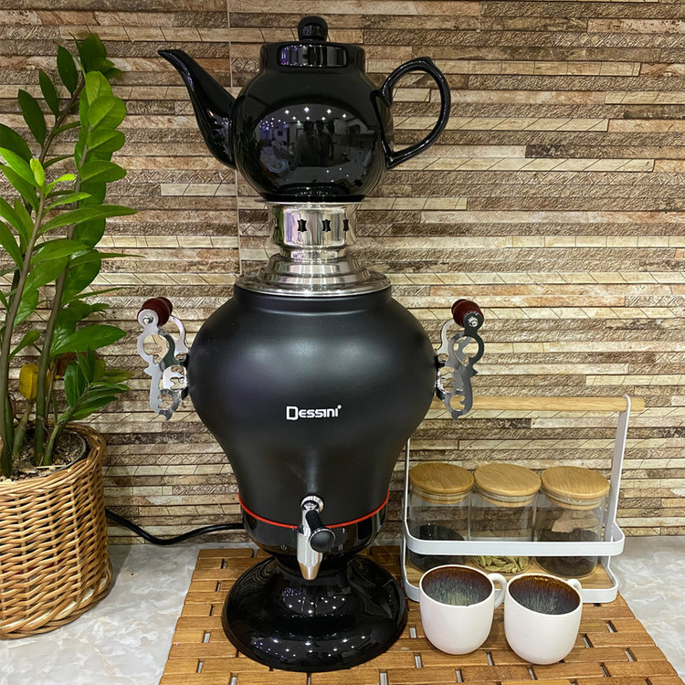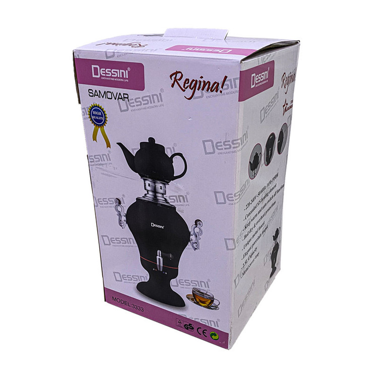 سماور برقی برند دسینی تحت لیسانس ایتالیا .گنجایش سماور 2.5 لیتر و ظرفیت قوری 1 لیتر است. قابلیت گرم نگه داشتن چای به مدت طولانی از دیگر ویژگی های این دستگاه میباشد. طراحی این دستگاه به حدی خاص و لاکچری است که تمام مشتریان را جذب خود کرده و تلفیقی از سبک کلاسیک و مدرن است که جلوه بی نظیری به آشپزخانه تان می دهد.این محصول بی نظیر با انرژی الکتریکی کار میکند، در کوتاه ترین زمان ممکن آب را میجوشاند. قدرت توان دستگاه 1950-1650 وات است که به سرعت المنت ها، روشن میشود. قدرت المنت ها به 2000 وات میرسد، این ویژگی مخفی درجریان گرم کردن آب نقش اصلی را ایفا میکند. یکی دیگر از مزایای این محصول همه کاره قابلیت تنظیم دما است که میتوان حرارت را به درجه مورد نظررساند.