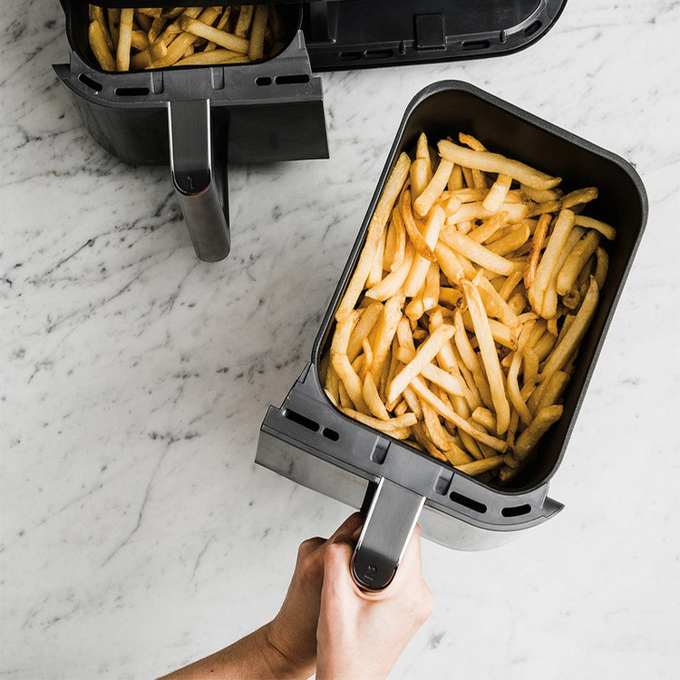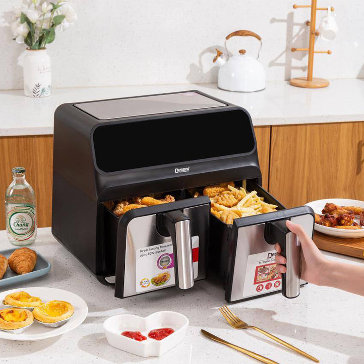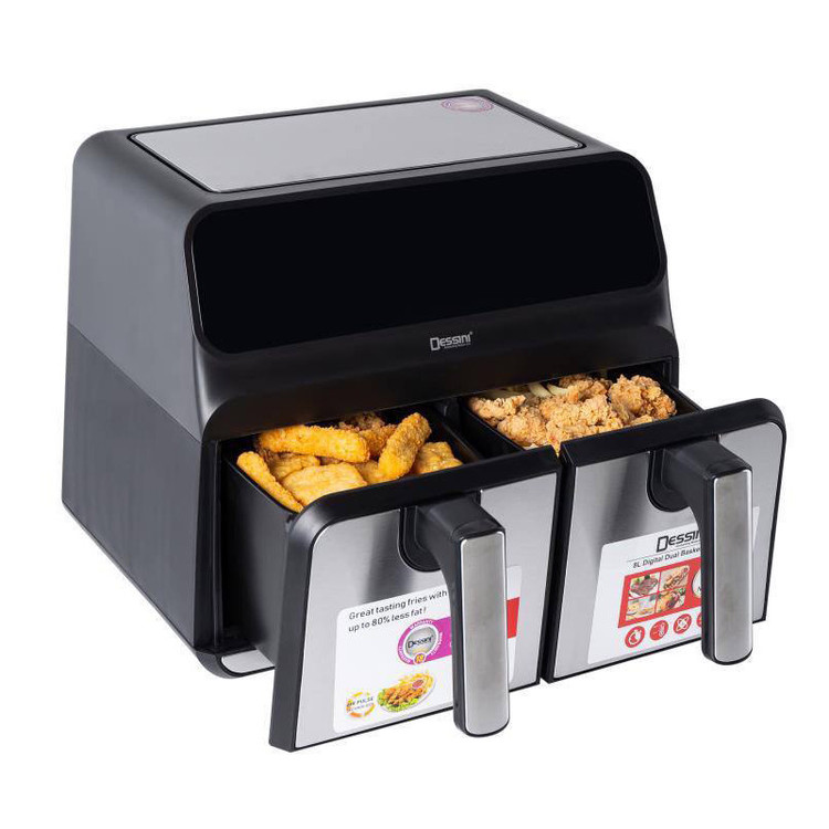 استفاده از سرخ کن های قدیمی به طور روزانه، خطرات بسیار زیادی را برای افراد به همراه دارد. زیرا طبخ غذا در آن ها به مقدار بسیار زیادی روغن نیاز دارد. پس از تولید سرخ کن های کم و یا بدون روغن طبخ غذا در آن ها سالم و کاملا لذیذ به شما تحویل داده می شود. سرخ کن دوقلو دسینی مدل DK-4242 یک دستگاه خوش قیمت و پرکاربرد بوده که در دیجی کالا موجود است. اولین ویژگی جذاب این محصول دوقلو بودن آن است. بنابراین شما قادر به استفاده ی مجزا از این محصول هستید. هرکدام از مخزن های این دستگاه 4 لیتر گنجایش داشته که جمعا 8 لیتر می شود. دارا بودن دو مخزن جداگانه خیلی بیشتر به کار می آید تا یک مخزن بزرگ داشتن. جنس بدنه ی این محصول از پلاستیک مرغوب ساخته شده و همچنین جنس داخلی آن از روکش نچسب بوده که هیچ تاثیری بر روی غذا ها نمی گذارد. همچنین غذا های در حال طبخ به قسمت های داخلی دستگاه نمی چسبد. پنل این سرخ کن لمسی بوده و با استفاده از آن شما قادر به انتخاب گزینه هایی همچون یخ زدایی، دما، تایمر، انتخاب برنامه های از پیش تعیین شده و …. هستید.