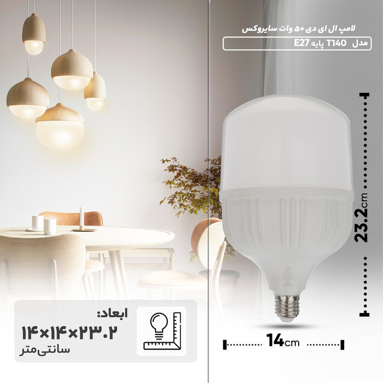 لامپ ال ای دی 50 وات سایروکس مدل T140 پایه E27، یک انتخاب مناسب برای روشنایی فضاهای گسترده است. این لامپ با طول عمر بالغ بر 15000 ساعت، از دوام و ماندگاری بالایی برخوردار است و نیاز به تعویض مکرر را از بین میبرد.