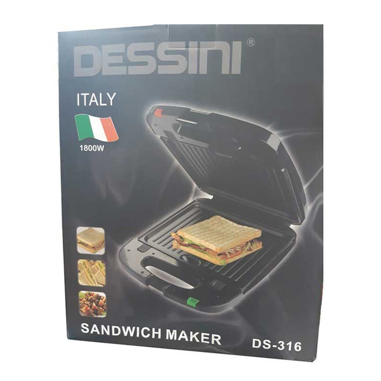 این دستگاه ساندویچ ساز محصولی از برند معتبر دسینی می باشد که سابقه درخشانی در تولید انواع لوازم خانگی دارد و شما می توانید با اطمینان خاطر محصولات این برند را خریداری کنید. همانطور که می دانید این برند متعلق به کشور ایتالیا می باشد که کیفیت فوق العاده ای در تولید محصولات خود ارائه می کند. ساندویچ ساز دسینی مدل ۳۱۶ دوکاره می باشد چرا که دارای دو سینی گریل و ساندویچ ساز است. قدرت این دستگاه ۱۳۰۰ وات می باشد و دارای دو صفحه برای گریل کردن و ساندویچ ساز است. ساندویچ ساز دسینی مدل ۳۱۶ دارای صفحات تفلون و المنتی می باشد که در مدت زمان کوتاهی داغ می شود. این ویژگی باعث می شود تا در کمترین زمان بتوانید غذای خود را آماده کنید. جنس صفحات این دستگاه از تفلون نچسب می باشد که مواد غذایی به آن نمی چسبد و شما می توانید از تمیز کردن ساندویچ ساز خیال آسوده ای داشته باشد.