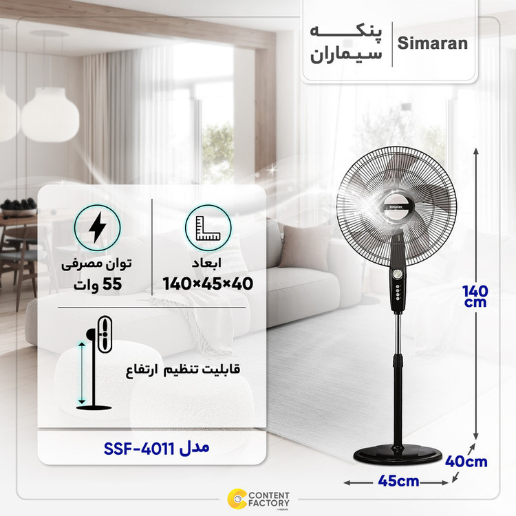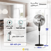 پنــکه ی ایستـاده سیمــاران مــدل SSF – 4011 با طراحی ساده و کلاسیک خود هــوای مــحیط را در مدت زمان کوتاهی کـاملا جابهـجا کـرده و کـلافـگی ناشی از روزهای گـرم را از بین میبرد و بـرای محیطهـای خانـگی و تجـاری بسیار مناسب است.این مدل به منظور برآورده ساختن نیاز مشتریان با طراحی کلاسیک خود به صورت آنالوگ عرضه شده است. به منظور تنظیم موقعیت باد میتوان ارتفاع پنکه را با استفاده از لوله یا پایه تــلسکـوپی به راحتی تغییر داد.ایـن دستگـاه دارای سه سرعـت کند - متوسط - تند است که با فشردن دکمه ON/SPEED کـه روی بـدنه دستگاه تـعبیه شده بـه سادگی میتوان میزان بـاددهی دستگاه را تنظیم کرد. همچنین این دستگاه مــجهز به تــایمر بـوده و بـا استفاده از این سیستم میتوانید میزان کارکرد پنکه را تا یک ساعت تنظیم و بـا خیال آسـوده استراحت کرده و یــا بــه کـــارهای دیــگر خود برسید زیرا با فعال شدن این سیستم دستگاه بعد از اتـمام زمـان تعیین شده به طـور خودکار خاموش میشود. در تمامی قطعات بهکار رفته شده در این پنکه از پـلاستیک مرغوب استفاده شـده تا در برابـر ضربه و افتــادگی از مقاومت بسیار بـالایی بــرخــوردار شوند. این محصول قابلیت استفاده بهصورت ایستاده ، رومیزی و دیواری را دارد .