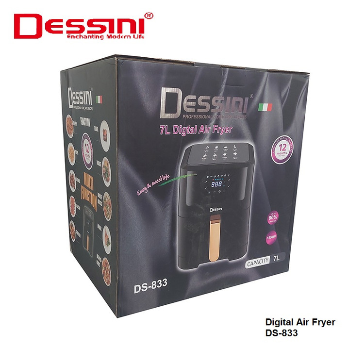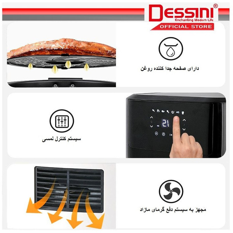 سرخ کن بدون روغن دیجیتال دسینی مدل DS833 با توان 1500وات و ظرفیت 7 لیتری یکی از جدیدترین سرخ کن های بدون روغن شرکت دسینی میباشد و جز سرخکن های بزرگ با ظرفیت بالا است که برای خانوار با تعداد بیشتر یا مهمانی ها بازدهی مطلوبی دارد و قابلیت تنظیم دما از 80 الی 200 درجه سانتی گراد و تنظیم زمان تا 60 دقیقه را داراست.این دستگاه قابلیت سرخ کردن انواع مواد غذایی را با کمترین کالری را دارد و با آن می توانید انواع غذاهای خوشمزه مانند مرغ سوخاری،سیب زمینی،استیک،جوجه سرخ شده، میگو،پیتزا ،ماهی و...را تهیه کنید .استفاده از این سرخ کن باعث عدم استفاده از روغن های خوراکی مضر شده که علاوه بر صرفه جویی اقتصادی خانواده ها ،برای کسانی که بیماری چربی دارند و از غذاهای پرچرب خودداری میکنند نیز بسیار مناسب می باشد. توزیع یکنواخت حرارت این دستگاه، موجب پخت بهتر مواد غذایی در کمترین زمان ممکن می گردد و زمان را برای شما میخرد تا به راحتی بتوانید به کارهای شخصی خود برسید. دستگاه سرخ کن رژیمی دسینی مدل DS-822 از مواد سازنده بسیار عالی و با کیفیت ساخته شده است و مقاوم در برابر ضربه و حرارت ساخته شده است بطوریکه بدنه در حین کار داغ نمی شود و می توان به راحتی و ایمن آن را لمس کرد.این دستگاه مجهز به صفحه نمایش ال ای دی لمسی می باشد که کار کردن با آن بسیار آسان می باشد.دسینی شرکت ایتالیایی است که با تولید محصولات با کیفیت و متنوع در زمینه لوازم خانگی، نقش بسزایی را در بازار داخل و خارج از کشور ایفا می کند. گفتنی است، بسیاری از کالاهای این برند در کشورهایی همچون ایران، ایتالیا، ترکیه و اسپانیا و...با بهترین کیفیت و متریال نیز ساخته و عرضه می شوند.برای جلوگیری از چسبیدن مواد غذایی هنگام سرخ شدن.ظرف آن از جنس تفلون متحرک طراحی گردیده تا شستشوی آن نیز آسان و راحت تر گردد.سیستم سرخ کن رژیمی دسینی مدل DS-833 دارای قابلیت ها و امکانات بسیار پیشرفته ای می باشد. که با استفاده از دماهای مختلف پختن غذاهای متنوع و خوشمزه را امکان پذیر می کند.این سرخ کن دارای تایمر خاموش شدن خودکار 60 دقیقه ای و محدوده دمایی 80 تا 200 درجه سانتی گراد است که می تواند بین حالات پختن، کباب کردن و برشته کردن انتخاب کنیدتابیشترین گزینه را برای پخت و پز در اختیار شما قرار دهد.