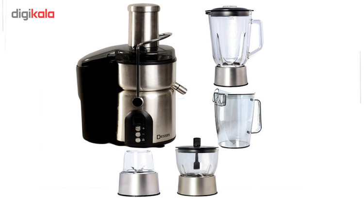 شرکت ایتالیایی دسینی (Dessini) یکی از تولید کنندگان بنام ومشهور ایتالیایی است. این شرکت در تولید انوع لوازم خانگی سابقه درخشانی دارد وبه دلیل کیفیت بسیار بالا ، طراحی های متنوع ،نوآوری ،استفاده از مواد با کیفیت، قیمت مناسب و خدمات پس از فروش این شرکت از استقبال زیادی بین مردم برخوردار است. وجود دستگاه آبمیوه گیری در آشپزخانه علاوه بر این که تنوع نوشیدنی های را که مصرف می کنیم بیشتر می کند می تواند ما را به خوردن مواد غذایی سالم عادت دهد . آب میوه گیری دسینی مدل ۳۳۳ یکی از محصولات کاربردی این برند است که عملکرد متفاوتی دارد این دستگاه چهار کاره است که علاوه بر عمل آبمیوه گیری دارای یک پارچ مخلوط کن به ظرفیت 2 لیتراست همچنین یک ظرف آسیاب و یک خرد کن به همراه این مدل به مشتری ارایه می شود. بدنه از جنس استیل و مقاوم در برابر زنگ زدگی است. موتور ۱۶۰۰ وات دستگاه قابلیت کار کردن در 5 سرعت را دارد و از توان آب میوه گیری فوق العاده ای برخوردار است بر روی این بدنه دکمه های فشاری تعبیه شده است که تنظیمات دستگاه از طریق آن انجام می شود. یک نمایشگر دیجیتال نیز در کنار این دکمه ها قرار گرفته است وجود این نمایشگر مشاهده و تغیر تنظیمات را راحت تر کرده است . از دیگر ویژگی های این دستگاه دهانه ورودی عریض آن است که به راحتی میوه های کامل مثل یک سیب کامل به قطر 75mm در خود جای می دهد پس از قرار گرفتن میوه در دهانه با استفاده از فشاری همراه دستگاه می توان میوه را به داخل دهانه هدایت کرد. مخزن تفاله برای این دستگاه در نظر گرفته شده که قادر به ذخیره سازی تفاله است .این مدل به گونه ای طراحی شده که از لغزش دستگاه در هنگام کار جلوگیری می کند و جنس بدنه و تیغه آبمیوه گیر استیل ضد زنگ است که در اثر استفاده و به مرور زمان زنگ نزده و فرسوده نمی شود. وجود سیستم ضد چکه از کثیف شدن فضای اطراف جلوگیری می کند همچنین سیستم ایمنی این دستگاه از بالا رفتن حرارت به دلیل استفاده طولانی مدت جلوگیری می کند. اجزا قابل جدا شدن و قابل شستشو می باشند.
