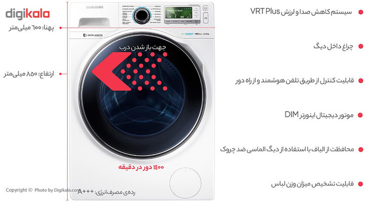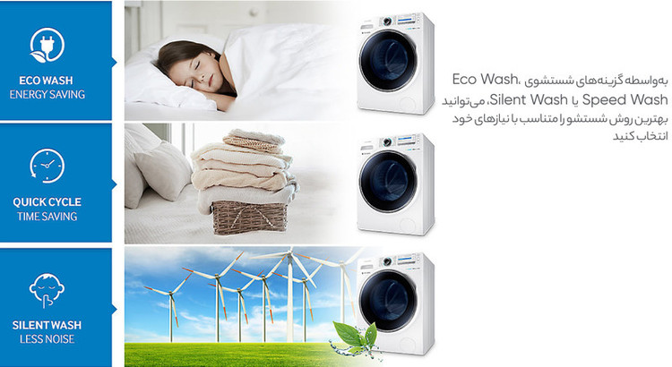 ماشین لباسشویی سامسونگ مدل H146 با ظرفیت 12 کیلوگرم ، یکی از لباسشوییهای شرکت سامسونگ است که ضمن از طراحی بسیار زیبا و مشخصات قابل توجهی از جمله ظرفیت مناسب و رتبه مصرف انرژی خوبی برخوردار است. این ماشین لباسشویی با ظرفیت 12 کیلوگرم میتواند در خانوادههای متوسط تا پرجمعیت مورداستفاده قرار گیرد. رتبه مصرف این دستگاه A+++ است و مصرف انرژی پایینی را خواهد داشت. سیستم کاهش صدا و لرزش VRT Plus از مزایای ویژه این محصول است. داخل دیگ در این مدل چراغ وجود دارد تا بتوان داخل ماشین را بهتر دید. از دیگر قابلیتهای این دستگاه دارای سیستم شستشوی چندحالته است که با وجود یک ولوم کنترلی Jog Dial که روی این دستگاه تعبیه شده است، کاربر میتواند به راحتی دستگاه را برای شستشوی البسه مورد نظر تنظیم و استفاده نماید. موتور دیجیتال اینورتر عملکرد دستگاه را به طرز چشمگیری بهبود بخشیده است. کاهش مصرف انرژی با استفاده از هیتر سرامیکی در سری جدید لباسشویی های سامسونگ انجام می شود. از دیگر مشخصات این دستگاه سیستم حفاظتی در نوسانات برق بوده که مانع از خرابی دستگاه می شود. محافظت از الیاف با استفاده از دیگ الماسه ضد چروک ممکن شده است. برنامه خودکار شستشوی دیگ لباسشویی نیز موجب میگردد مصرفکننده دیگر نگران تمیزی دیگ که شاید کیفیت شستشوها را نیز تحت تأثیر قرار دهد نباشد. سیستم عیب یابی هوشمند و پیش شستشو با کف هم در مدل H146 سامسونگ لحاظ شده است. این ماشین لباسشویی قابل کنترل از طریق تلفن هوشمند و از راه دور نیز هست که جز ویژگی های منحصر به فرد مدل H146 محسوب می شود. سامسونگ تولید و عرضه کننده محصولات با کیفیت در زمینه های مختلف از جمله لوازم خانگی برقی است. نوآوری، استفاده از مواد با کیفیت، قیمت مناسب و خدمات پس از فروش این شرکت، مخاطبین زیادی را به سمت خود کشانده و راضی نگه داشته است.