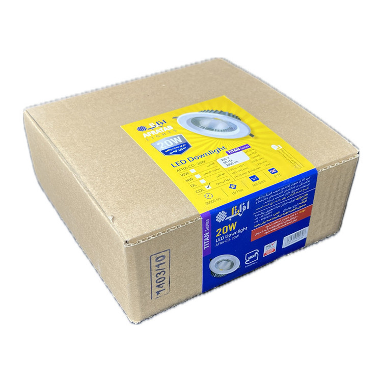 چراغ ال ای دی سقفی 20 وات توکار از سری چراغهای ال ای دی Titan Series سری تیتان افراتاب با طراحی جدید بدنه آلومینیومی و درایور ارتقاء یافته می باشد. در تولید این چراغ از فناوری COB استفاده شده است. این چراغ با شار نوری فوق العاده 1700 لومن از محصولات Super Lumen سوپر لومن افراتاب می باشد. ابعاد چراغ 5.5×16.5 سانتیمتر قابل نصب در برش 14.5-14 سانتیمتر میباشد. زاویه تابش این چراغ 105 درجه میباشد.
