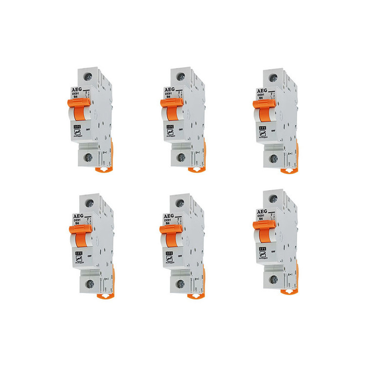 فیوز مینیاتوری تک فاز 6 آمپر آ ا گ مدل DE91 کد B6 وع کلید: تند کار (تیپ B) - جریان نامی: 6 آمپر - قدرت قطع جریان اتصال کوتاه: 6 کیلو آمپر - ولتاژ نامی: تک فاز 230 ولت - حفاظت اضافه بار (عبور جریانی بیش از جریان نامی) و اتصال کوتاه (اتصال فاز و نول) - دمای کارکزد: 5- تا 40 درجهی سانتیگراد - درجهی حفاظت رطوبتی IP20 - قابل نصب روی ریلهای 35 میلیمتری (DIN RAIL) می باشد